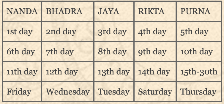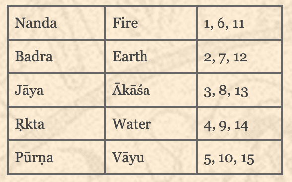 | Purna | Air | 5, 10, 15 (Full/New Moon) |